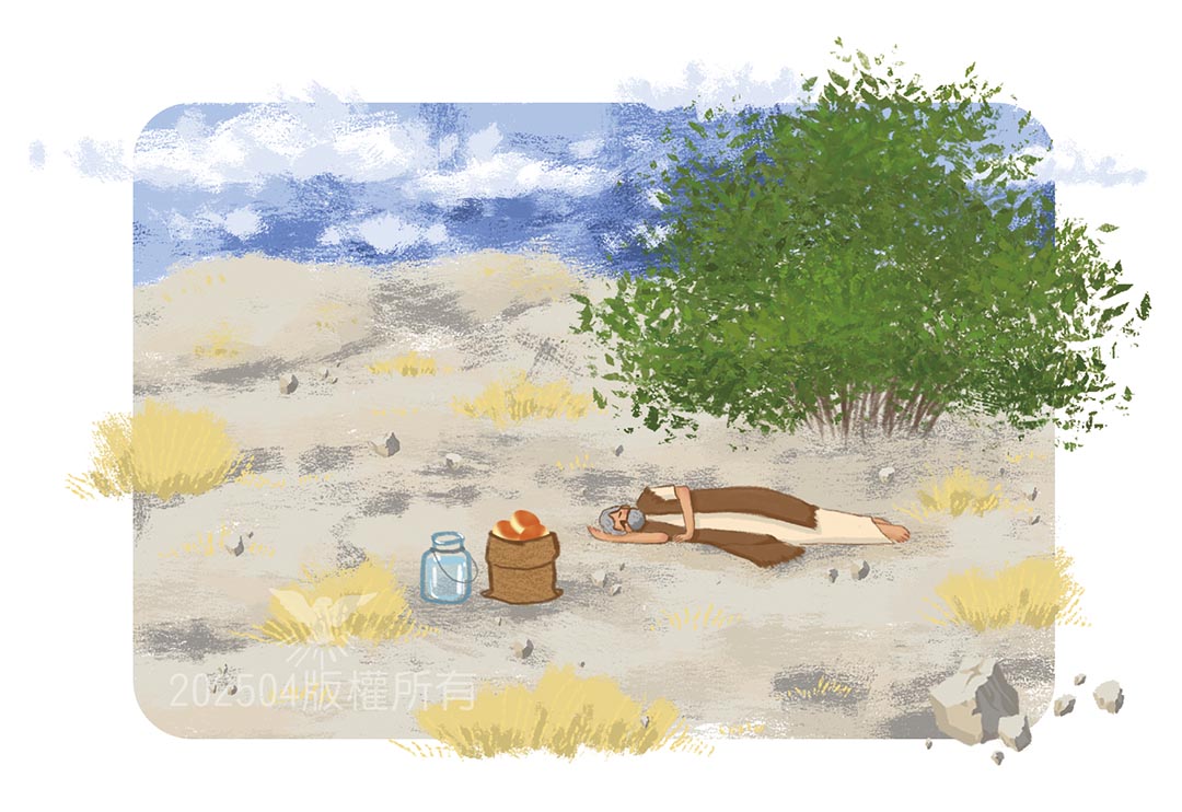 以利亞向神求死之後,就躺在羅騰樹下睡著。神派天使連續兩次給他提供水和炭火燒的餅,並告訴他:「起來吃吧!因為你當走的路甚遠」。以利亞吃了之後,便有了體力,走了四十晝夜,到了何烈山(5-8節)。