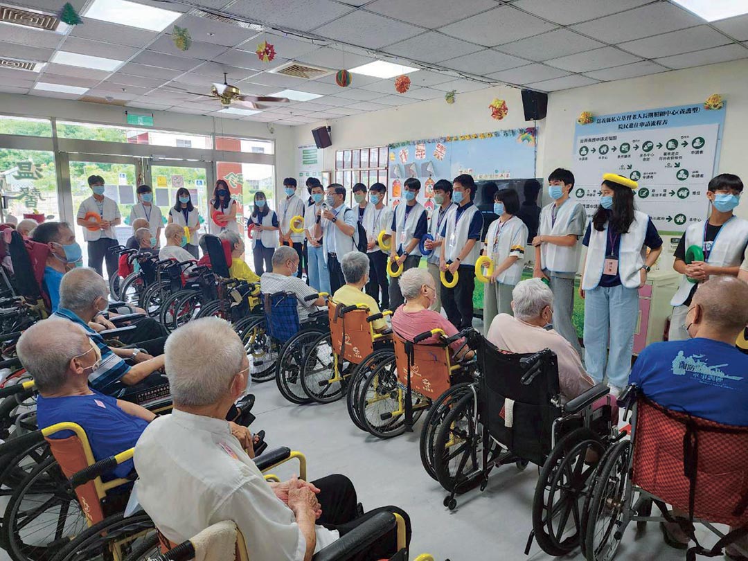 第二天,我們前往大林基督養護中心。那裡的長輩大多行動不便、坐在輪椅上,只有少部分能自行走動。我們在開場的帶動跳時,將手搖鈴發給長輩,讓他們可以跟著節奏打拍子。我注意到一位長輩也很想用樂器跟著打節拍,只是他的手實在沒有力氣,一用力就會發抖。於是我輕輕握住他的手,陪著他一起跟著音樂打節拍,最後我們也順利完成這個活動。
