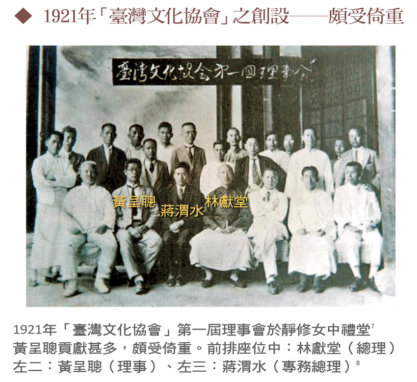 黃呈聰貢獻甚多,頗受倚重。前排座位中:林獻堂(總理)、