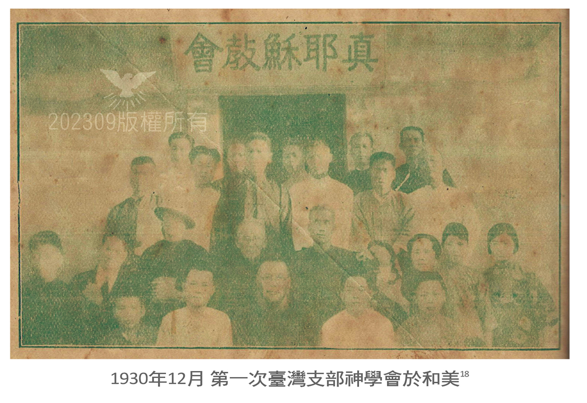 18.本和美神學會合照委實不夠清晰,因至今仍找不到原照,被迫暫時採用當年1930-12-31《聖靈報》封面(第五卷 第十一、十二期合刊)照片,盼來日能找到原件,較為清晰。此外,上述講員中,黃以利沙、黃基甸兩長老在合照裡,似沒出現;本照片及旁白由筆者原著轉用——陳宏模,〈臺灣神學教育90週年溯源(二)(1930-2020)〉,文載《聖靈》月刊,545期, 2023年2月號,頁77-81,此處見頁80。
