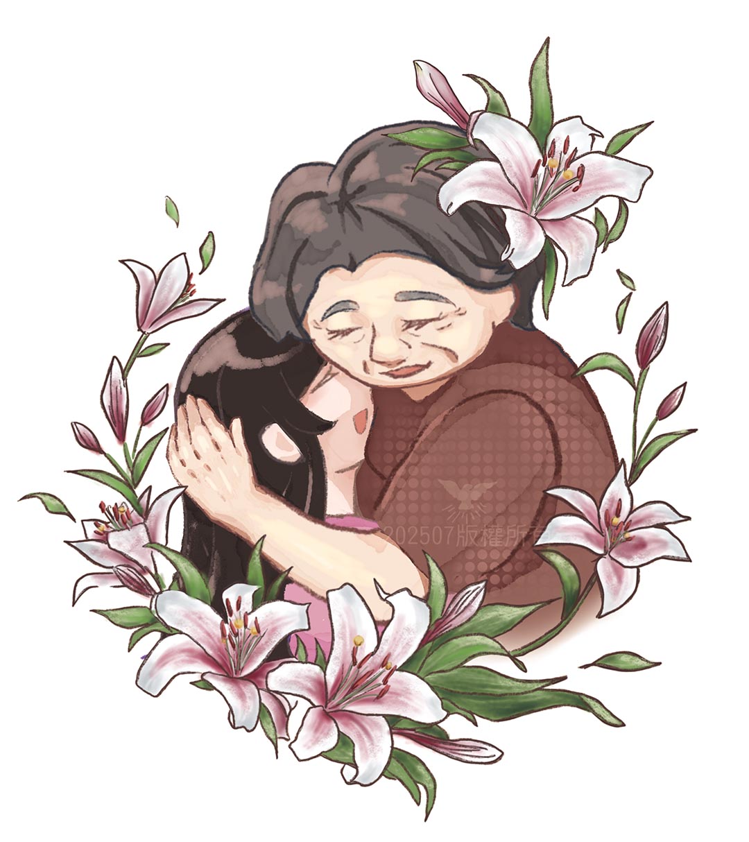 爺爺因大腸癌過世,您對爺爺的思念與悲傷很深,但當年就讀小學一年級的我,實在不知該如何安慰您,只能靜靜地躺在您的身邊,與您一起流淚、想念爺爺。