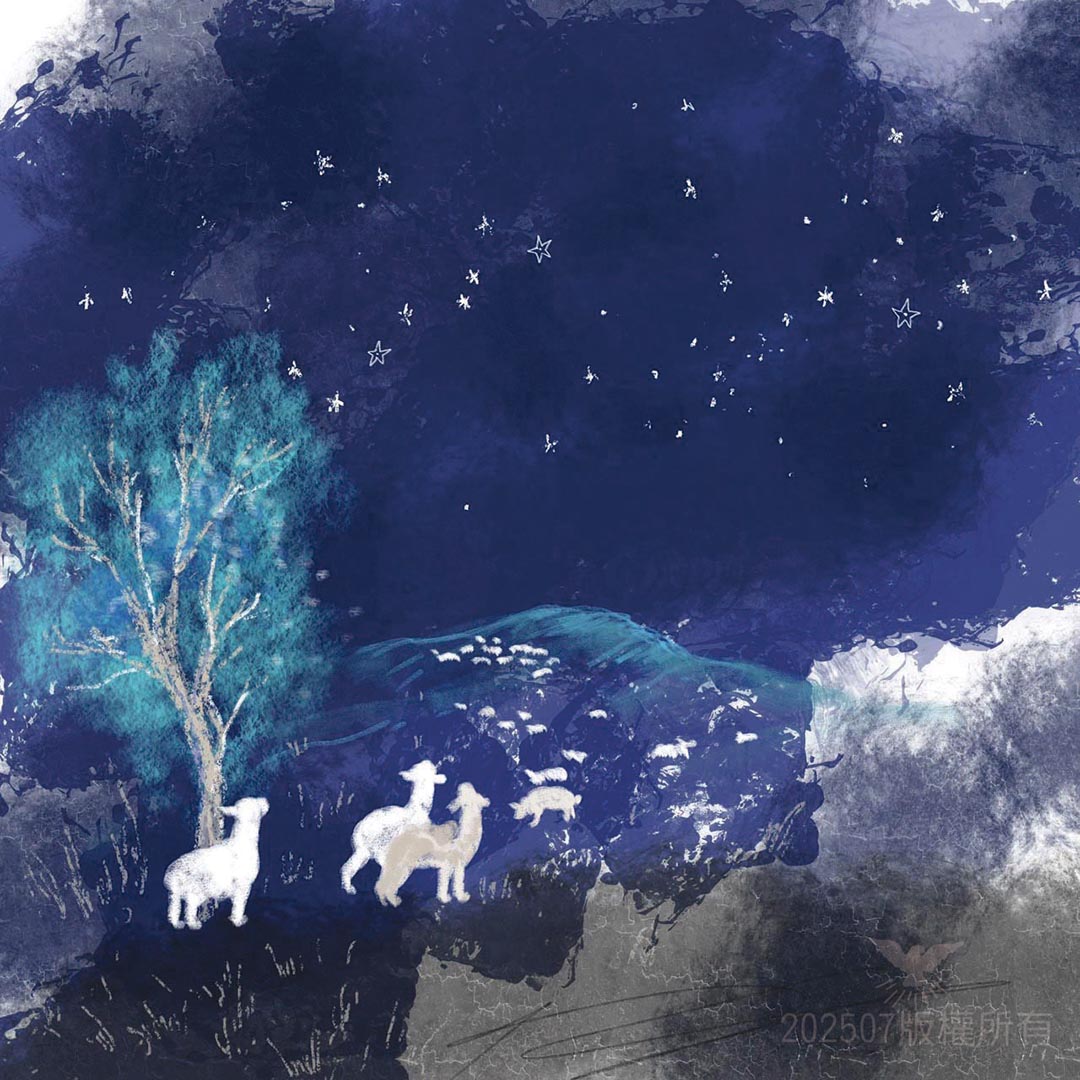 他的手突然摸了摸身後,那根牧羊杖仍存留著他的體溫。他從身下拿出那根生發了奇蹟的杖。在夜空下,左看右看,細細端詳。羊群中的領頭羊以為主人有了新動向,立刻抬起頭來,一臉嚴肅地看著他,等待他下達出發的命令。
